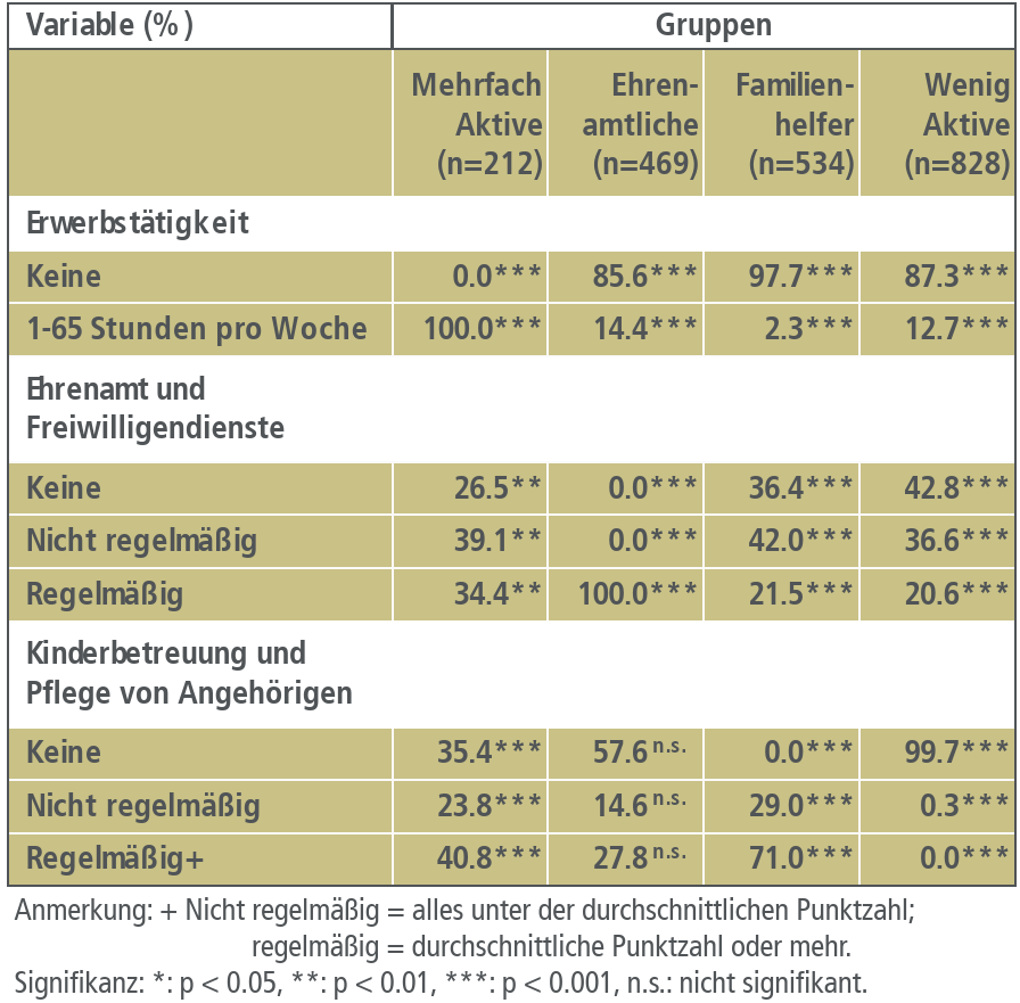 1. die mehrfach Aktiven, die alle eine Erwerbstätigkeit ausüben und darüber hinaus oft noch ehrenamtlich oder in der Familie aktiv sind (10,4% der Befragten)